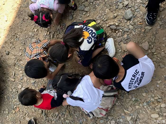 午饭结束,孩子们在农家乐门口围成一圈,玩河里的鹅卵石,也不知道是啥游戏