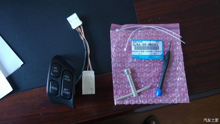 车型:2011款自动时尚型出厂日期:2011年5月巡航:飞哥的单个巡航开关面板(国产) 幸运的是我的马6没有减配,只需配个巡航开关就行了,想想一汽马自达也真是的,为了省那么点成本就把定速巡航的配置就减了,其实配置没减掉,就减了个开关,这不是纯欺负你吗,让你花大把钱加装,还好论坛里有飞哥,帮我们省钱,几百块就搞定了。 废话不说了,开工了,直接上图:收到的宝贝飞哥会给你详细的教程,很详细的,不懂的人也会装,这里我就不发了,我发的全是我自己的安装过程的照片国产的面板比原装的要亮点,按键有声音,咔哒咔哒声,毕竟国产的,使用功能还是一样的拆气囊:拆方向盘:...