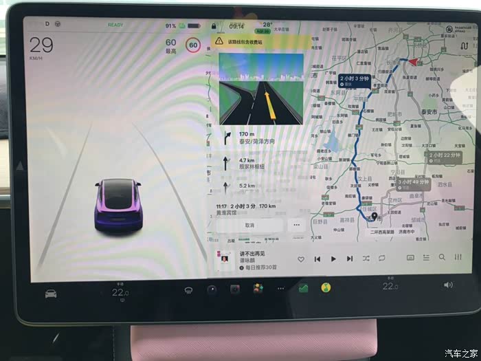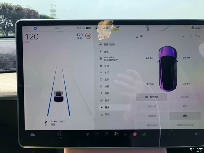 去程,济南-济宁。前几日济南高温,然后下了一场大雨,所以出发日的地面温度低,车机显示冷胎压前轮2.4,后轮2.5。在市区行驶到高速入口时,胎温升高,热胎压前后均为2.5。