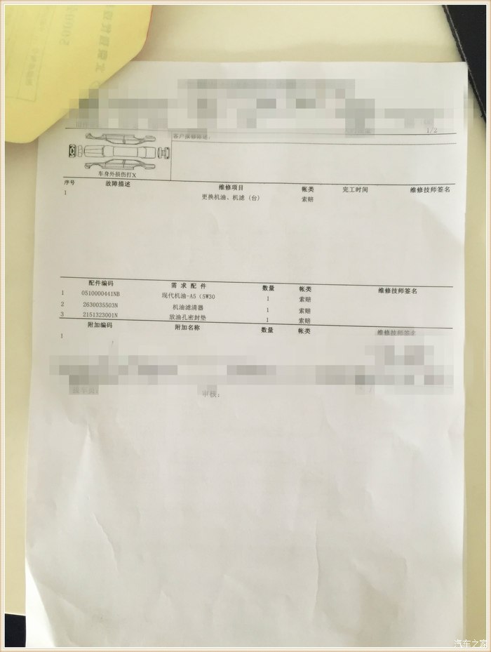 最后是清单上的价格:现代机油-A5 (5W30) 280元 机油滤清器 30 放油孔密封垫 5元 因为首保免费工时费不详。