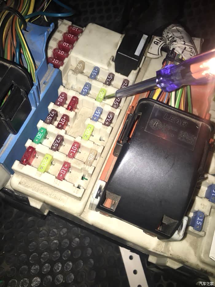 正极一定要连这个试电笔的另一端。图片试电笔的位置是保险丝的正极,如果功放线路接错,容易把功放烧掉。连保险丝负极,比较安全。有问题保险丝就烧了。