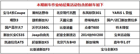 2、此次征集的车系为“2013年末新车汇总征集活动”后的上市热门新车集中征集,详见下表: