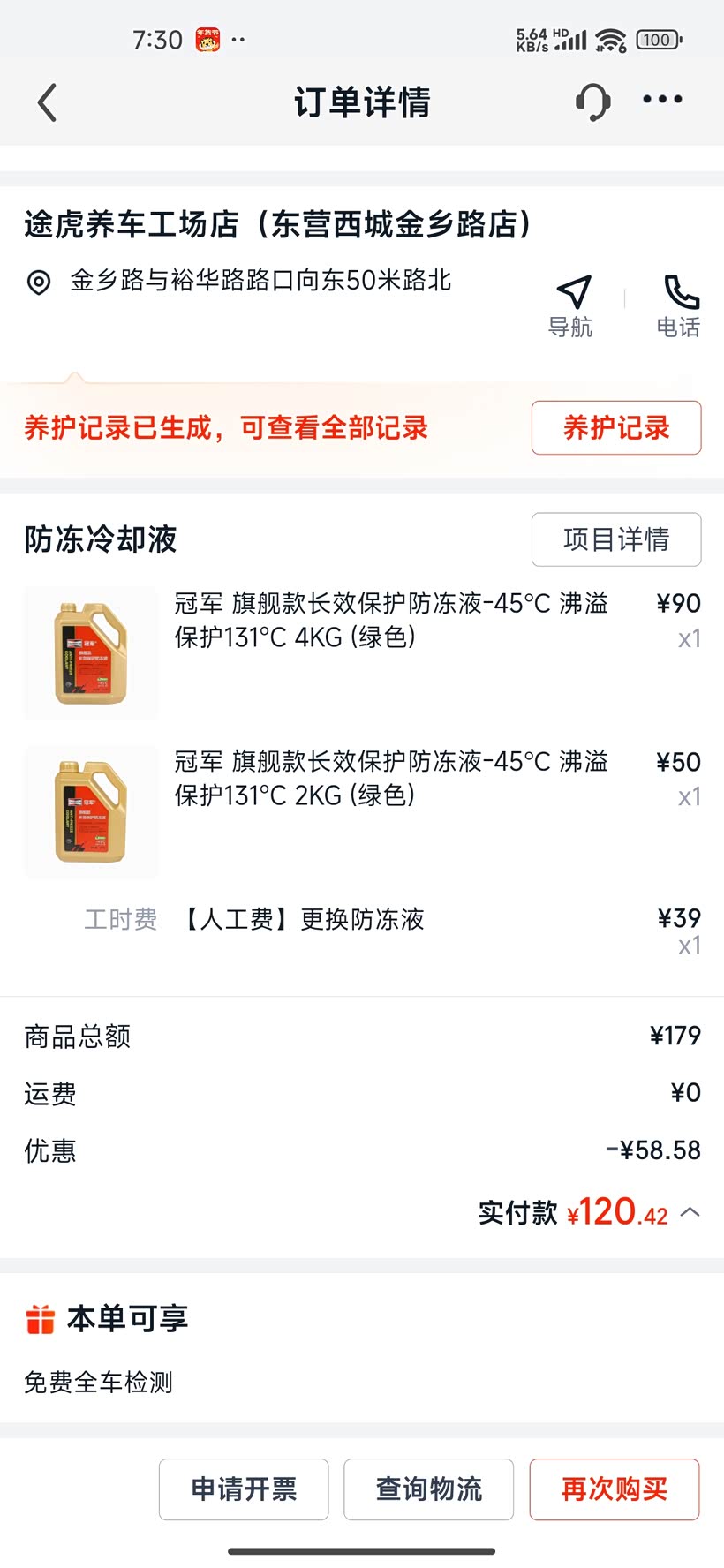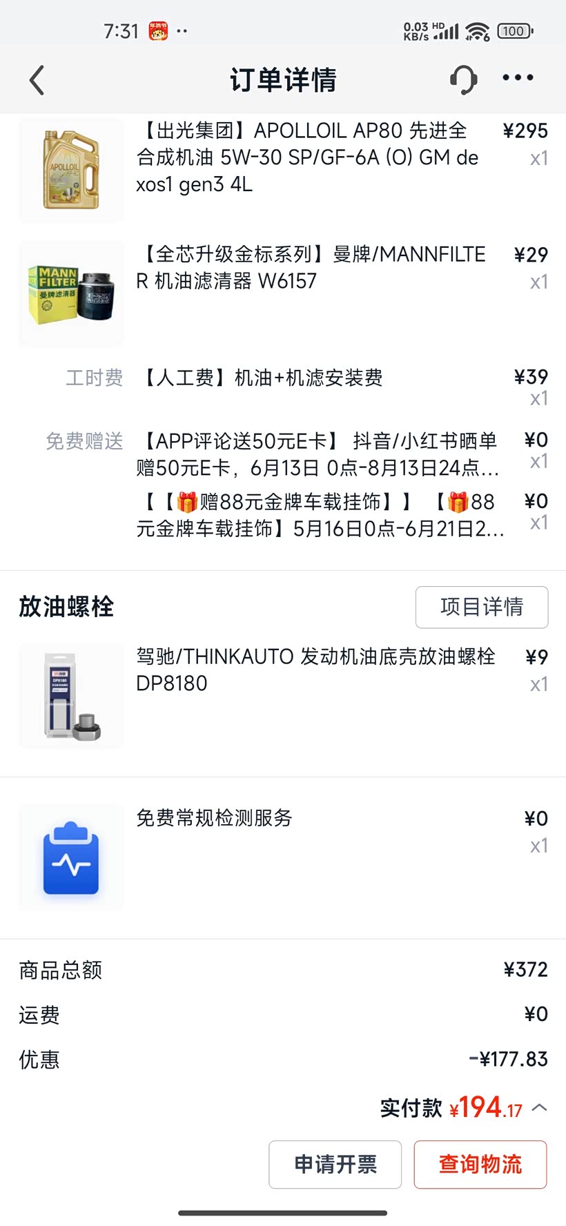 保养一共花了不到400,更换了机油机滤,还有冷却液。机油机滤不到200元,冷却液120多点,总体比较满意。