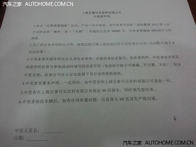 然后11月。。是几号来着。。忘记了。。就有一个电话打来,号码是一号店的400号码,但是前面怎么还有区号,说我中奖了。我当时第一反应就觉得是骗子,就说回去查一下。后来回去看,确实有这么回事,但是也还是害怕是骗子,又到处打电话,活动页面的电话,上海百事的电话,闵行公证处的电话,都说有这么回事。然后我就去上海拿车了,此处省略N个字。