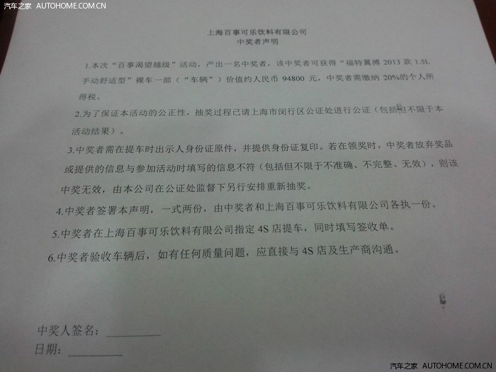 中奖声明,一式两份。没签之前的。