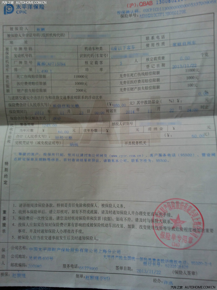 保单,太平洋,只有交强险。