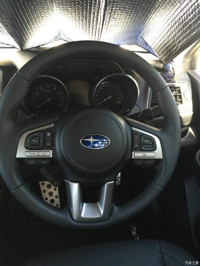这是我的大礼物,大灯是LED和卤素结合。低光是LED,高光是卤素。前车窗那两个摄像头就是2015款主打的Eyesight系统,自适应巡航、预碰撞系统等等就是靠它发挥作用。