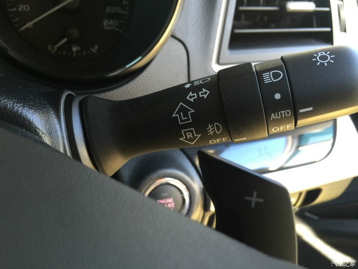 多功能方向盘带换挡拨片,手动调节,全系标配。[S]是Sport模式,[I]是Intelligent模式,另外仪表盘的有11种颜色可以换,调了女朋友最喜欢的紫色。方向盘后面,左边是雨刮带自动感应。右边是方向灯和大灯、雾灯的开关,大灯带自动感应。另外,那个安全带未扣提醒好像是全车座位都有感应,如果是驾驶位的安全带未扣,车辆是无法起步,就算是已经挂了D档。