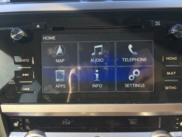 中控台,按钮的阻尼系数不错,按得很有质感。屏幕是全触屏,还有导航和倒车影像。另外手机还可以通过蓝牙和它连接来播放音乐和打电话。