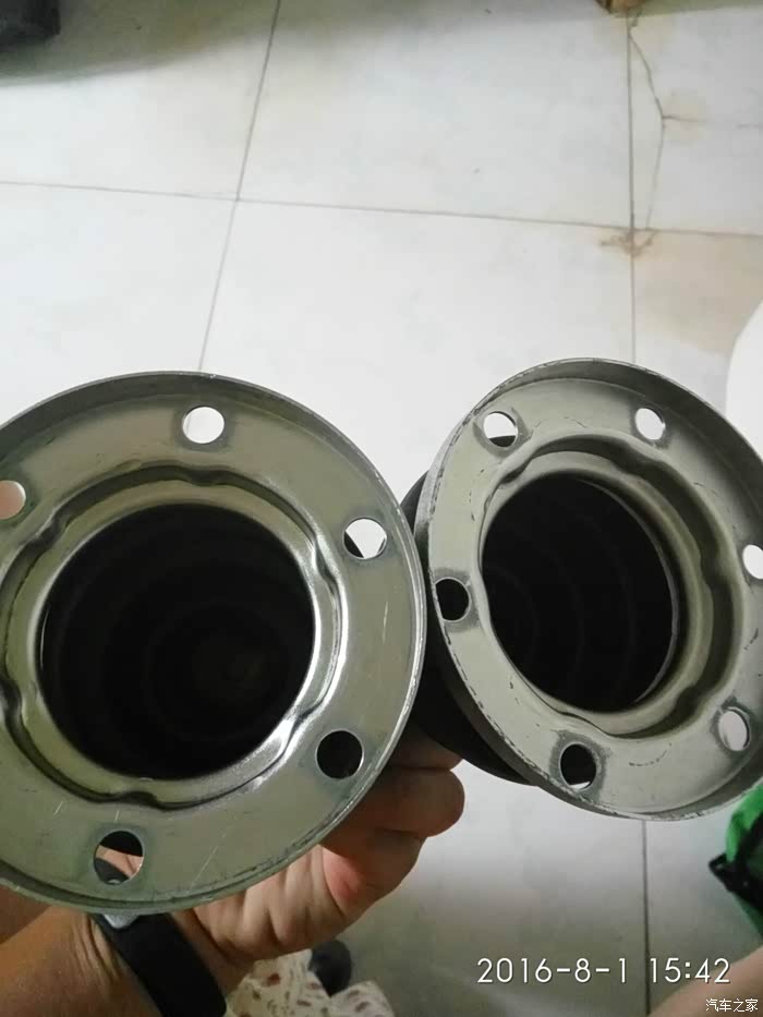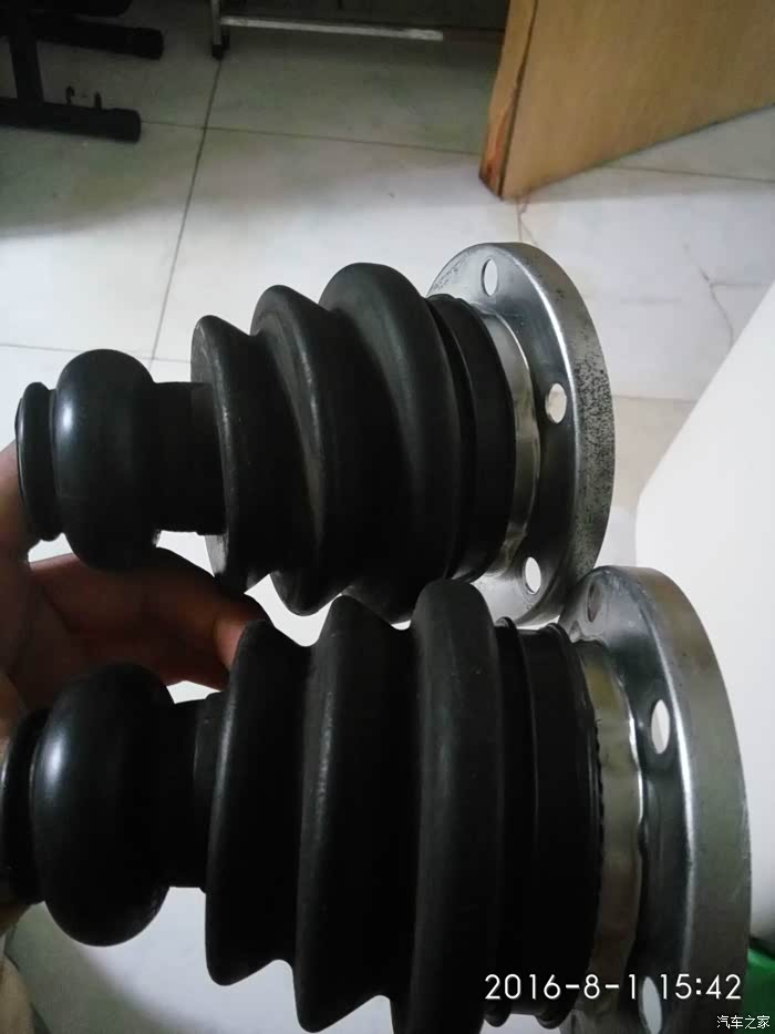 下面就是要更换外球笼套。先将外万向节,与胶套分离,然后用橡胶锤敲击外万向节边缘部分,将其与传动轴分离。如果敲不下来,也有办法。内外万向节都有四部分组成,从里到外分别是球骨,弹珠(6颗),球笼,球壳,将六颗弹珠取出(球笼是可以上下左右各个方向活动,就可以去除弹珠),然后你试着上下转动,顺逆时针转动球笼就可取出,最后是球壳。球骨内圈是齿牙与传动轴上的齿紧紧固定,这时候拿一把榔头和平口长起子,按照对角线敲击球骨边缘,就可以取出球骨。外胶套自然就可以取出更换,顺便自己可以把万向节里外清洗,检查。先用废纸将上面的油脂清除,在用汽油,洗的非常干净。外万向节的安装,球骨有一个正反面,球笼不分正反,球壳套入胶套就行,弹珠很好安装,多转转就可以进去了。安装弹珠确保各部件干净,安装好,各方向转动,上润滑脂,就OK. 剩下安装外胶套(最好在传动轴和胶套内部涂抹汽油套入会很容易),先将最小的胶套卡箍放进去(切记很重要,别忘记顺序),然后套入外胶套,再是大的的卡箍,将万向节套入传动轴,用橡胶锤敲击到位。固定大小卡箍,要用到比较长卡箍钳子固定大小卡箍。传动轴外部就全部OK。