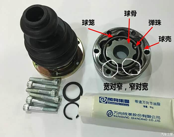 第八步,安装内万向节,很重要,如果安装错误,内万向节无法活动,卡死。内外向节四部组成分丛里到外:球骨,六颗弹珠,球笼,球壳。这里头,弹珠和球笼都不分任何顺序。只要能装进入就OK。但是仔细观察最里头的球骨和最外头的球壳。你会发现,球骨的边是一宽一窄,一共六条,球壳的边也是一宽一窄,一共六条,安装的时候,一定是球骨的窄边对应球壳的宽边,装入弹珠,保准ok。如果宽对宽的话,装好就杯具了,卡死,动不了了。弹珠安装技巧,从下,也就是胶套上方安装相对容易很多。