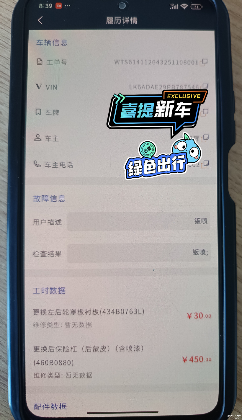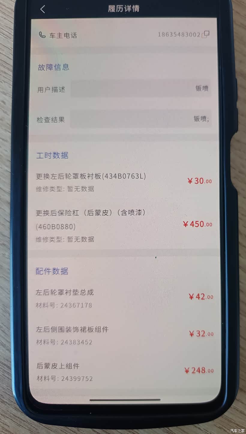 这里我要说明一下,票据丢失,去4S店要票据,票据已经全部交回集团了。所以查了维修记录,记录里面不全,其中更换左后轮罩板衬板30元,更换后保险杠(后蒙皮)含喷漆450元,左后轮罩衬垫总成42元,左后侧装饰裙板组件32元,后蒙皮上组件245元,一共802元,实收829元。