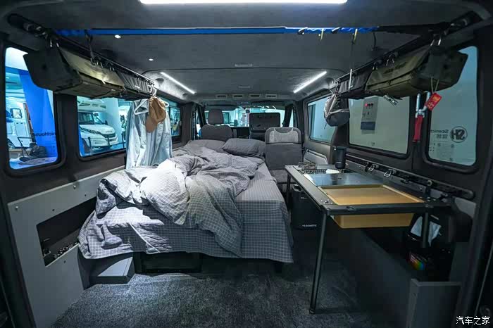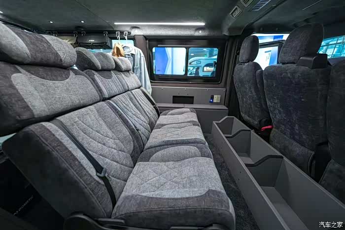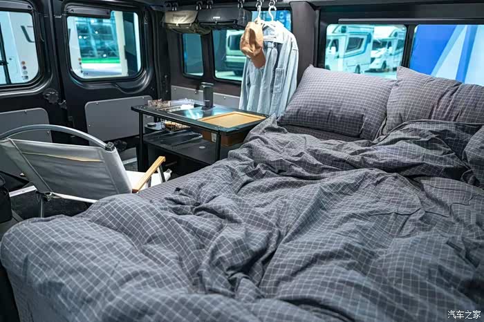 车内还配备隐私玻璃、整车高级地毯及绒布遮光窗帘,搭配超静音空气循环机,打造出私密又舒适的休息空间。同时,还可根据实际需求选装12V 400Ah或12V 800Ah锂电池、DC充电模块、3000W逆变器、2000W柴油风暖、驻车空调、车尾冲凉套件系统等,进一步提升旅居的舒适度和便利性。