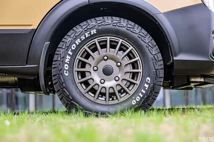 烟沙黄与超哑黑的拼色车身设计,使车辆极具辨识度。底部包围的超哑黑涂装,搭配哑光灰多辐轮圈及科马仕CF1100全地形AT越野胎,不仅提升了车辆在不同路况下的行驶能力,还营造出强烈的视觉冲击,硬派风格与复古气质完美融合。前中网格栅由密集蜂窝状图形组成,经过整体黑化处理后与两侧大灯组相连,塑造出硬朗俊俏的前脸,开在路上回头率爆表。