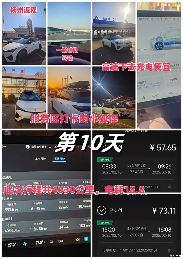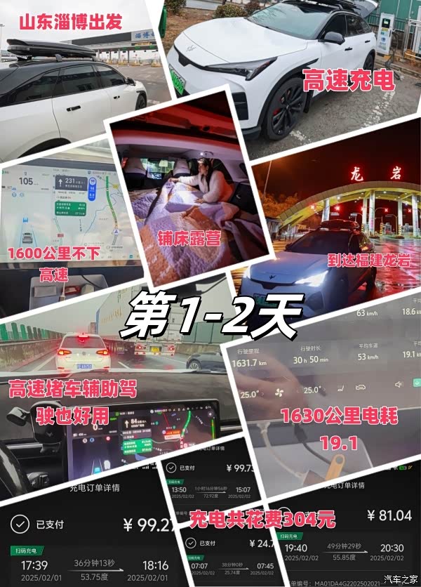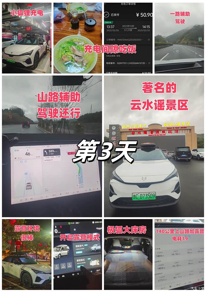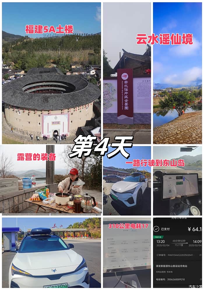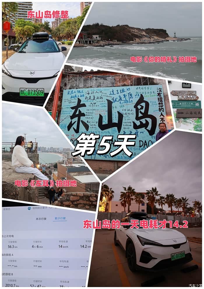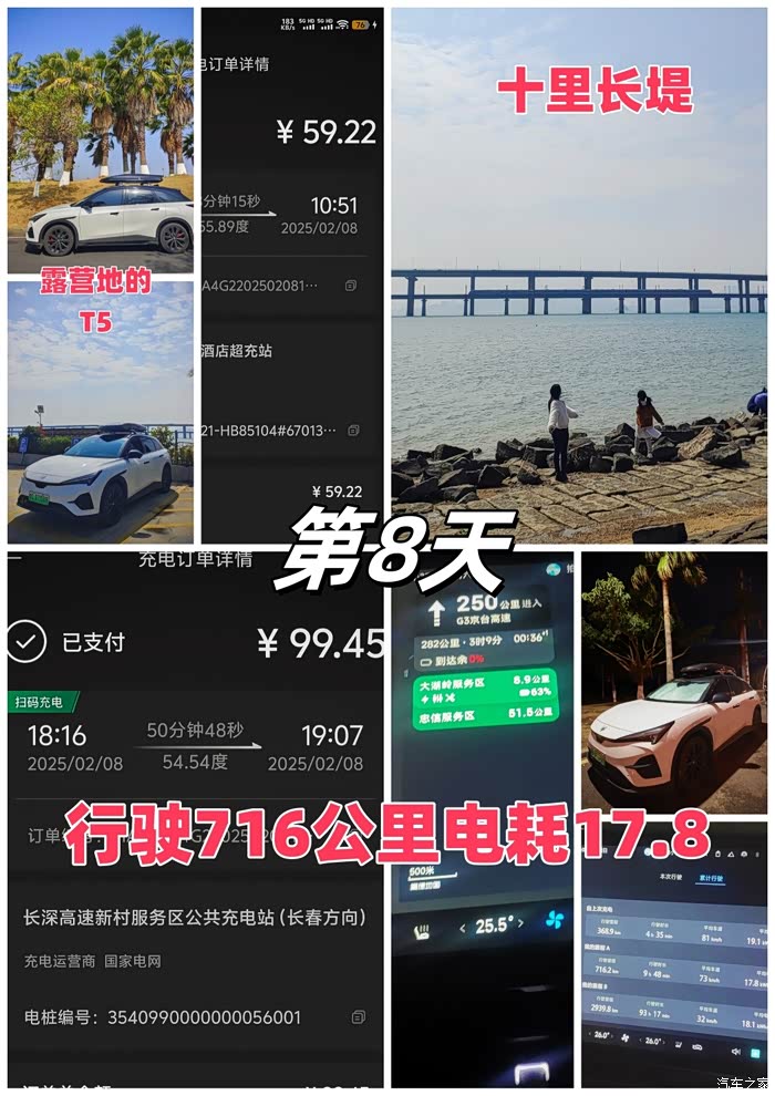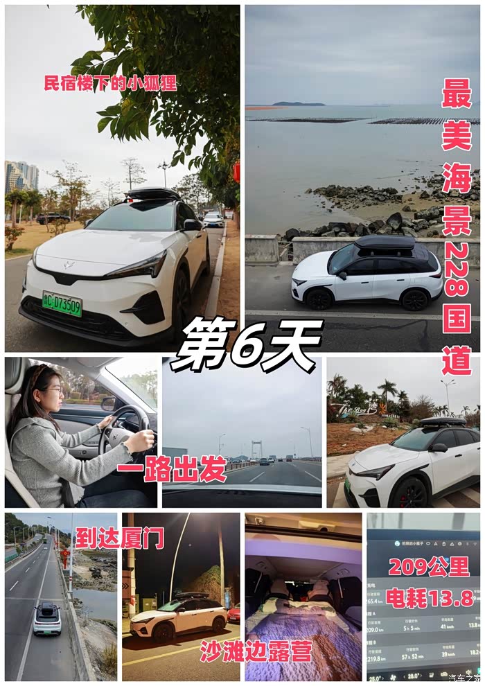 续航实测:此次行程每天都进行电耗实测,第1-2天淄博到龙岩全程不下高速中间合肥服务区露营一晚上共1630公里电耗19,第3-4天龙岩到南靖土楼140公里加露营一晚上在前往东山岛总共310公里电耗17,第5天在东山岛海边行驶56公里电耗14.2,第6天从东山岛沿着美丽海景228国道前往厦门行驶了209公里,电耗13.8,第7天厦门的休闲时光,第8天厦门到衢州716公里高速电耗17.8,第9天衢州到皖南川藏线到扬州494公里电耗19,第10天扬州返回淄博593公里电耗20.此次路线一共4034公里,平均电耗18.8,全程充电11次,花费才814元。