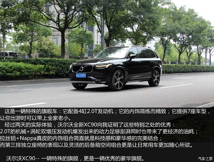 首先,问大家一个问题:说到豪华品牌的旗舰车型, 大家想到的是什么? 我想答案无外乎是这些:硕大的车身、奢侈的空间、澎湃的动力、木纹的内饰、酷炫的科技。。 是的,我的答案也和你完全一样,直到我遇到了沃尔沃全新XC90。  至此,有些读者心里会轻微吐槽了:表弟啊,你就别在这装文艺范搞步步深入了,你不会告诉我你今天介绍的是一辆车身窄小空间紧凑动力孱弱内饰朴素毫无科技的旗舰车吧?! 呵呵,当然不是了。 前面我做了这些铺垫,只是想引出这次出行的主角--沃尔沃全新XC90 T6 7座版: 它当然是一辆旗舰,也绝对是一辆特殊的旗舰。特殊在什么地方,我们一步一步的看下去。