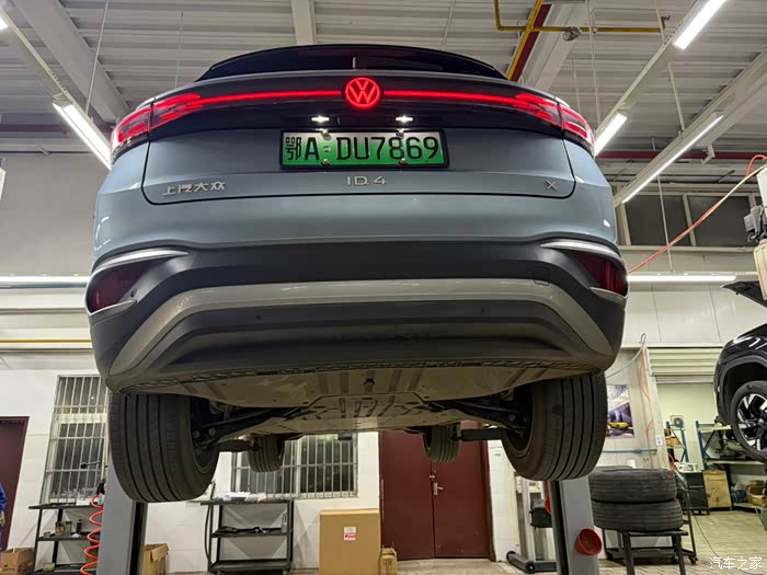 第二步:将我的爱车底盘顶起,检查底盘是否有磕碰、变形或锈蚀现象,确保传动部件和悬挂系统的正常运作。特别是对电池的部分会仔细的观察。我的底盘情况良好,暂时无刮蹭情况。