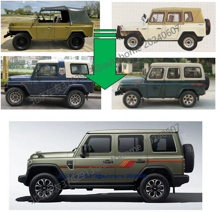 新款212终于正式与大家见面了,总体感觉比过去谍照及申报图片要好看,特别是前脸,在车身尺寸增大,大灯间距增大的情况下,还是尽量的保持了原来的感觉。如果说还有不太满意的地方,就是侧面造型了,依然是D柱倾斜 和 后侧门造型(三角 还是 阶梯)。这两点 也是BJ212和BJ2020的造型特点的一部分,特别是区别于坦克、40等。