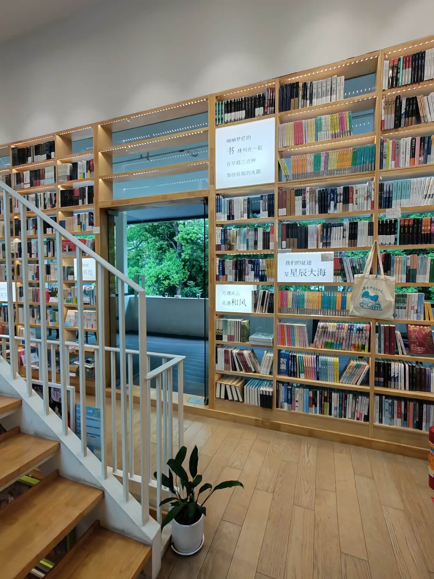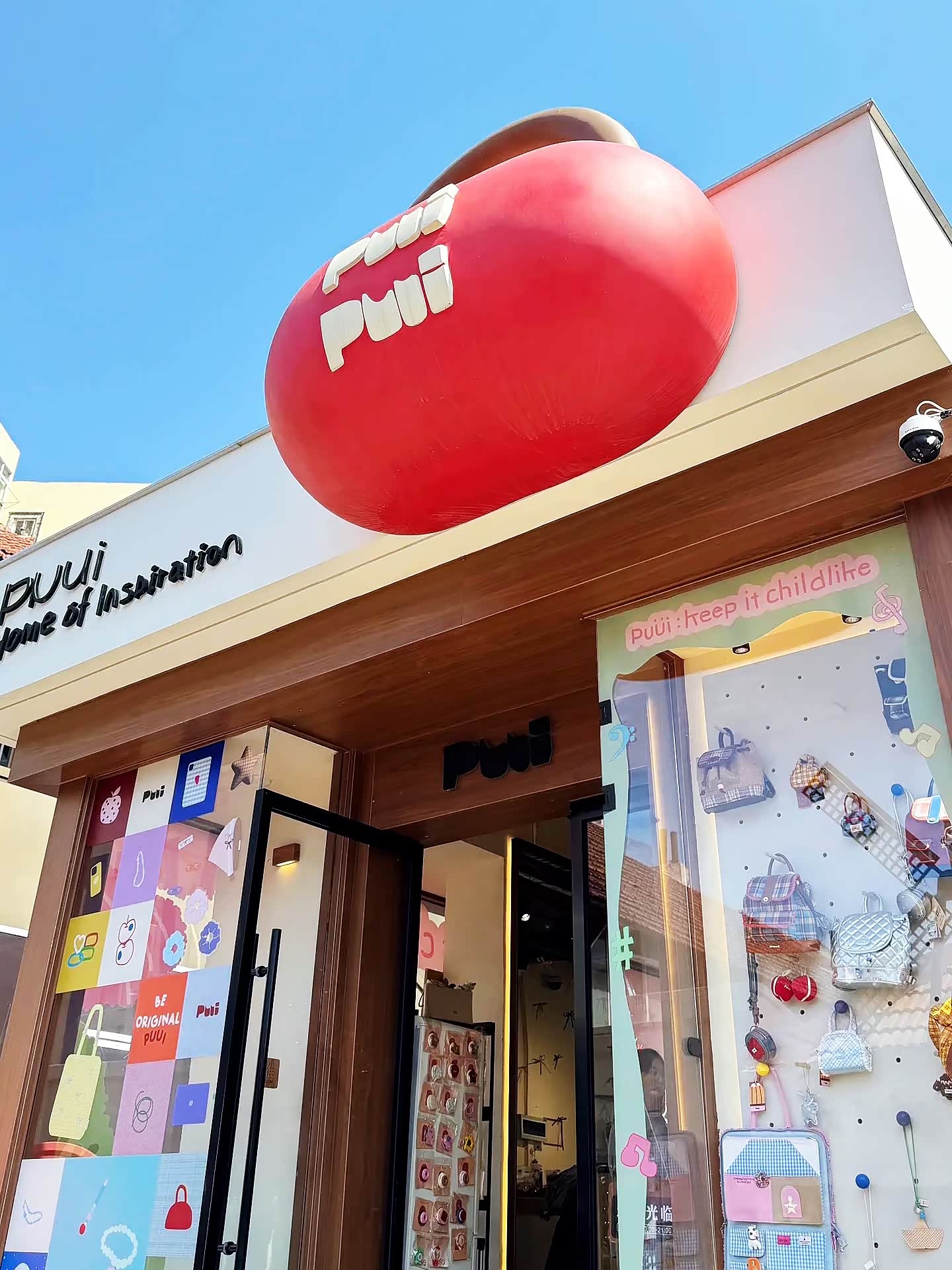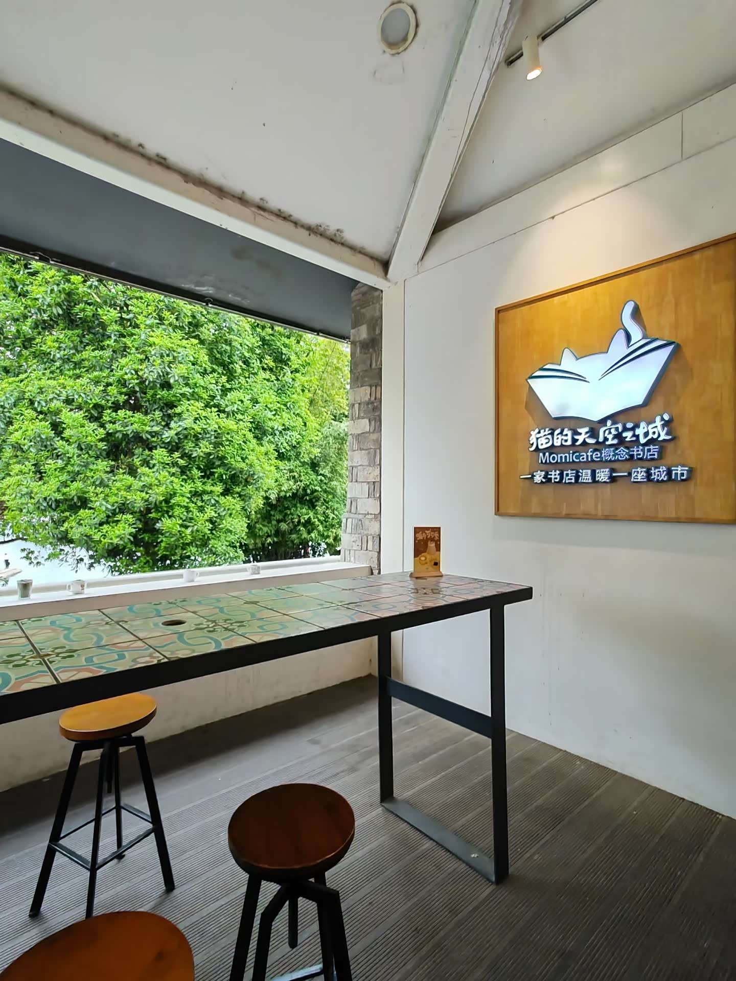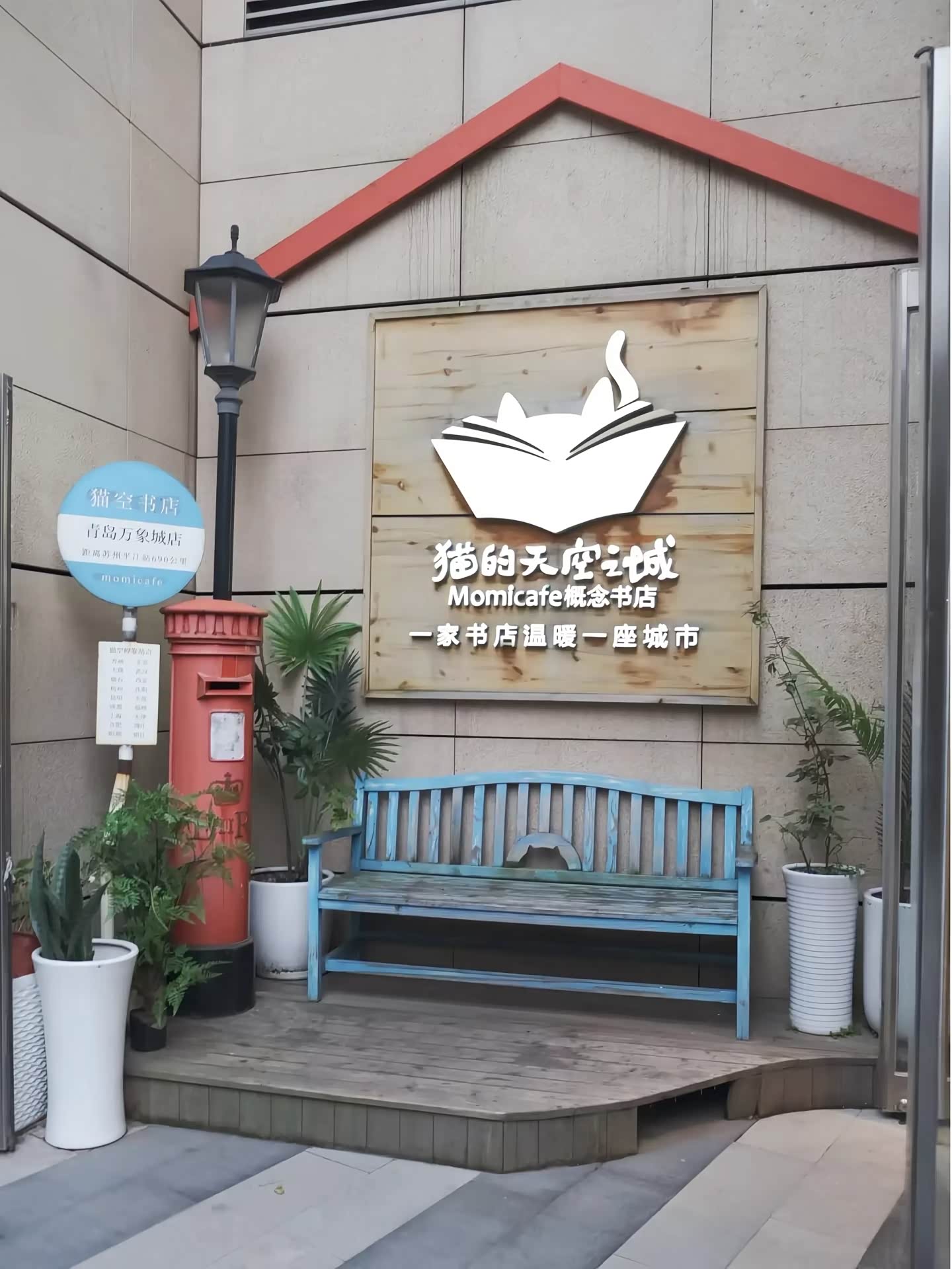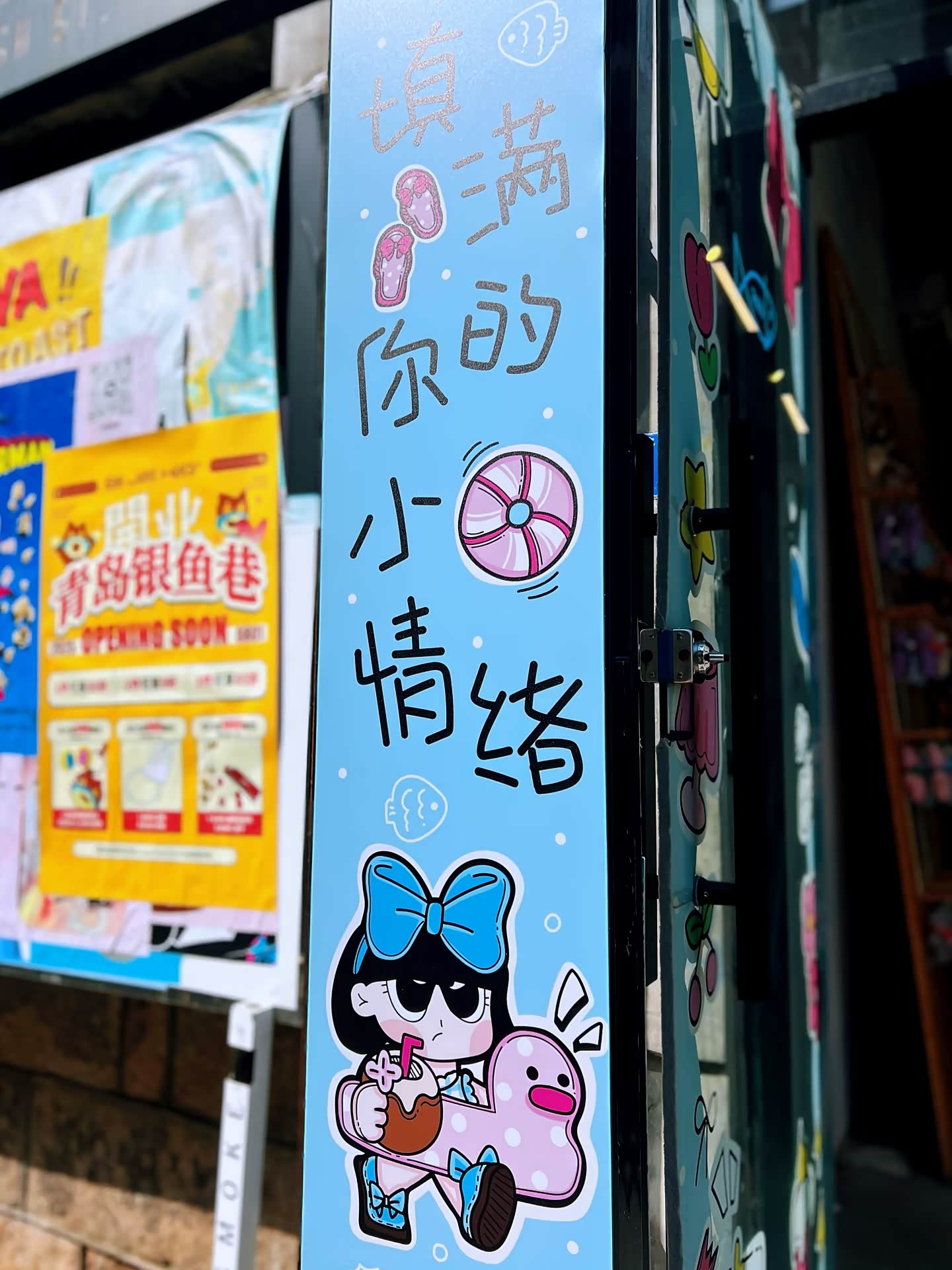 沿着红砖墙往里走,巷子两旁的小店渐渐多了起来。有的店面用原木色的招牌搭配白色的窗框,透着日式小清新的气息;有的则用涂鸦装饰外墙,色彩鲜艳又充满个性。我们首先走进了“猫的天空之城”,这家概念书店在全国都小有名气,但银鱼巷分店却有着独特的青岛韵味。