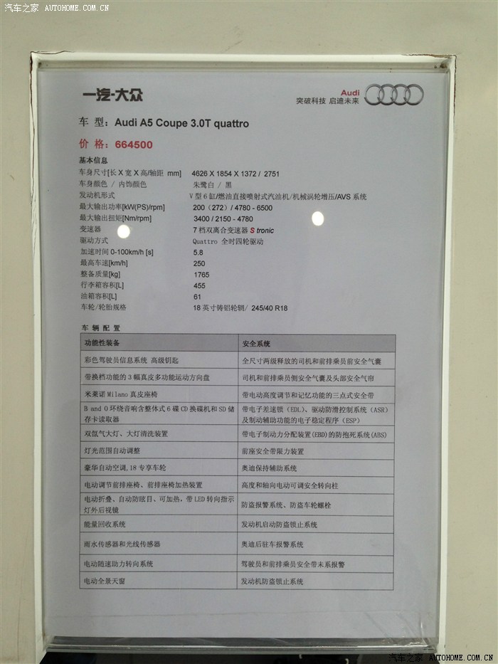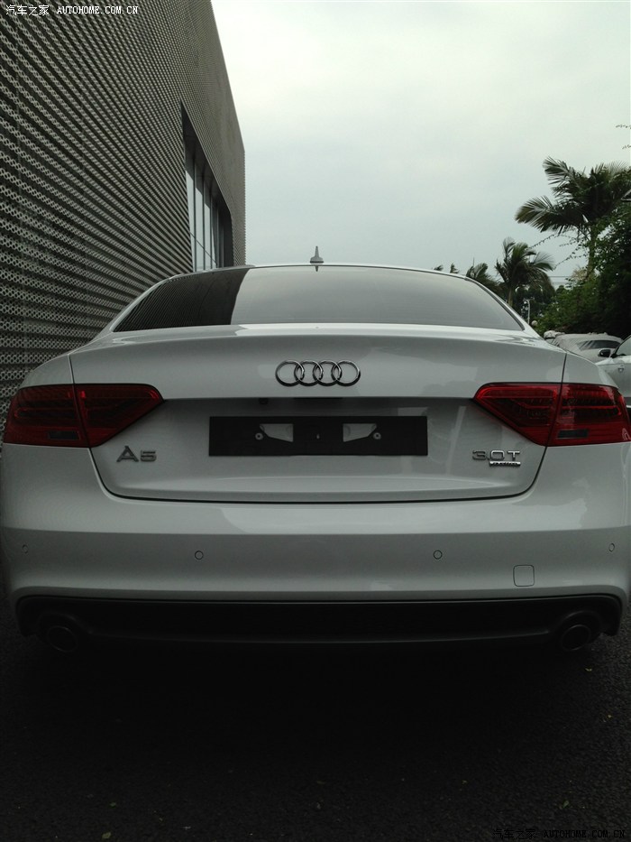 再看看自己当时想要的,不就是一辆A5,我怎么想那么远,也很佩服自己敢想。4.29LD说去看车吧,心里目标就是A5,一去奥迪展厅就看到它,3.0T,我要的配置都有了,唯一的遗憾是轮毂不是自己想要的19,不过想想算了,订车又要4个月,不想等了,就它了。隔天下订金。然后4S送的抛光贴膜还有加装倒车影象。五一4S工人休息所以弄好已经是5.4。