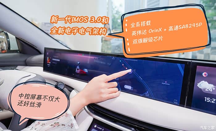 新一代IMOS 3.0和全新电子电气架构,智舱·智驾全域融合全系搭载英伟达 OrinX + 高通SA8295P 双旗舰级芯片,开创性集成S32G高性能芯片,带来智舱·智驾全域融合的升维体验