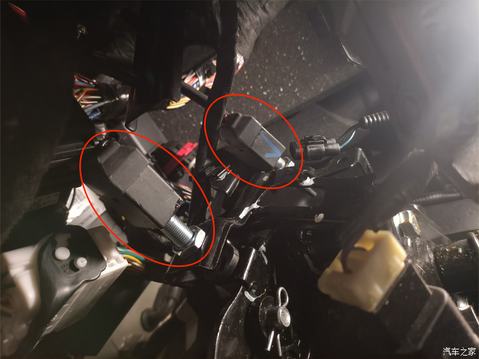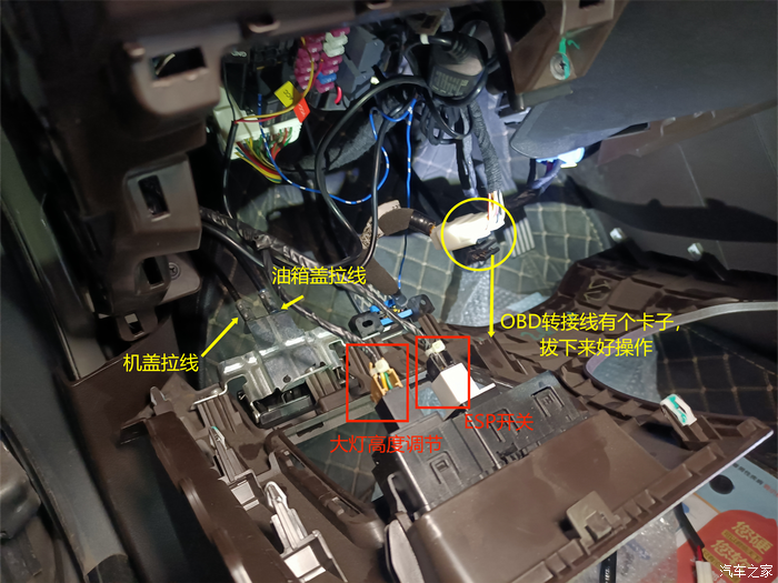 5.记下线的位置开始拆线,这里的线按住卡子一拔就出来了,两根拉线颜色不同,机盖的是线头是黄色的、油箱盖的线头是蓝色的,没拍细节,这个一眼就看出怎么安装上去的了非常简单。