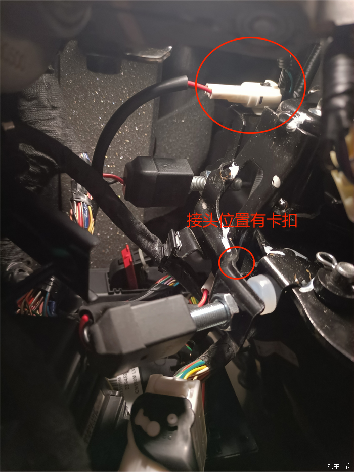 7.拆下开关,换上新买的开关。这里要找人用棍子帮你把离合压下去,再把开关放进去扭动后边的螺母初步定位,让人松开离合确定能把开关压下的位置再定位。用靠近大头那边的螺丝定好位置后再扭上小头的螺丝。注意拆的时候接头背面有卡扣,不能硬拔,接头的卡扣也很紧,用尖嘴钳或者螺丝刀压一下推才可以。