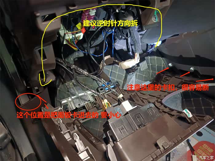 4.卸下两颗螺丝后,从方向盘右下方(油门那边)开始,逆时针方向一个个撬开卡扣,撬完如图。