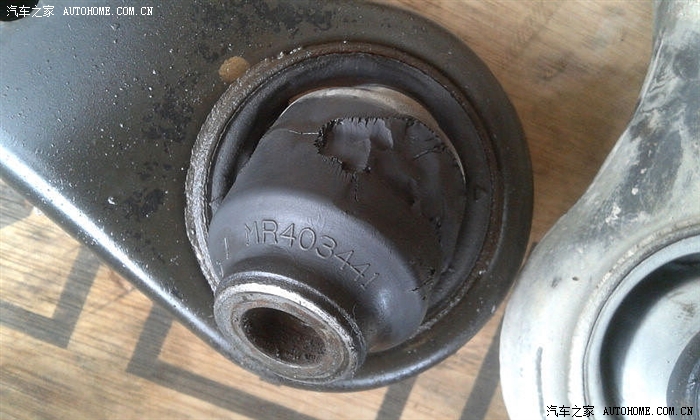 2012年11月中28.2万公里,清洗散热系统(详见,后来导致水管穿孔,建议不要用腐蚀性溶液洗水箱),马今年出现滑行后踩油门,车要挫一下才开始加速的现象,感觉是哪里间隙很大,但检查过波箱、差速器等,都没问题,仅半轴有一点点的虚位。直到小龙来大修发动机,发现我的前轮前后晃动。经查下摆臂的橡胶关节完全断裂了。马上换了下摆臂,问题解决。拆下的原装下摆臂球头还非常好。