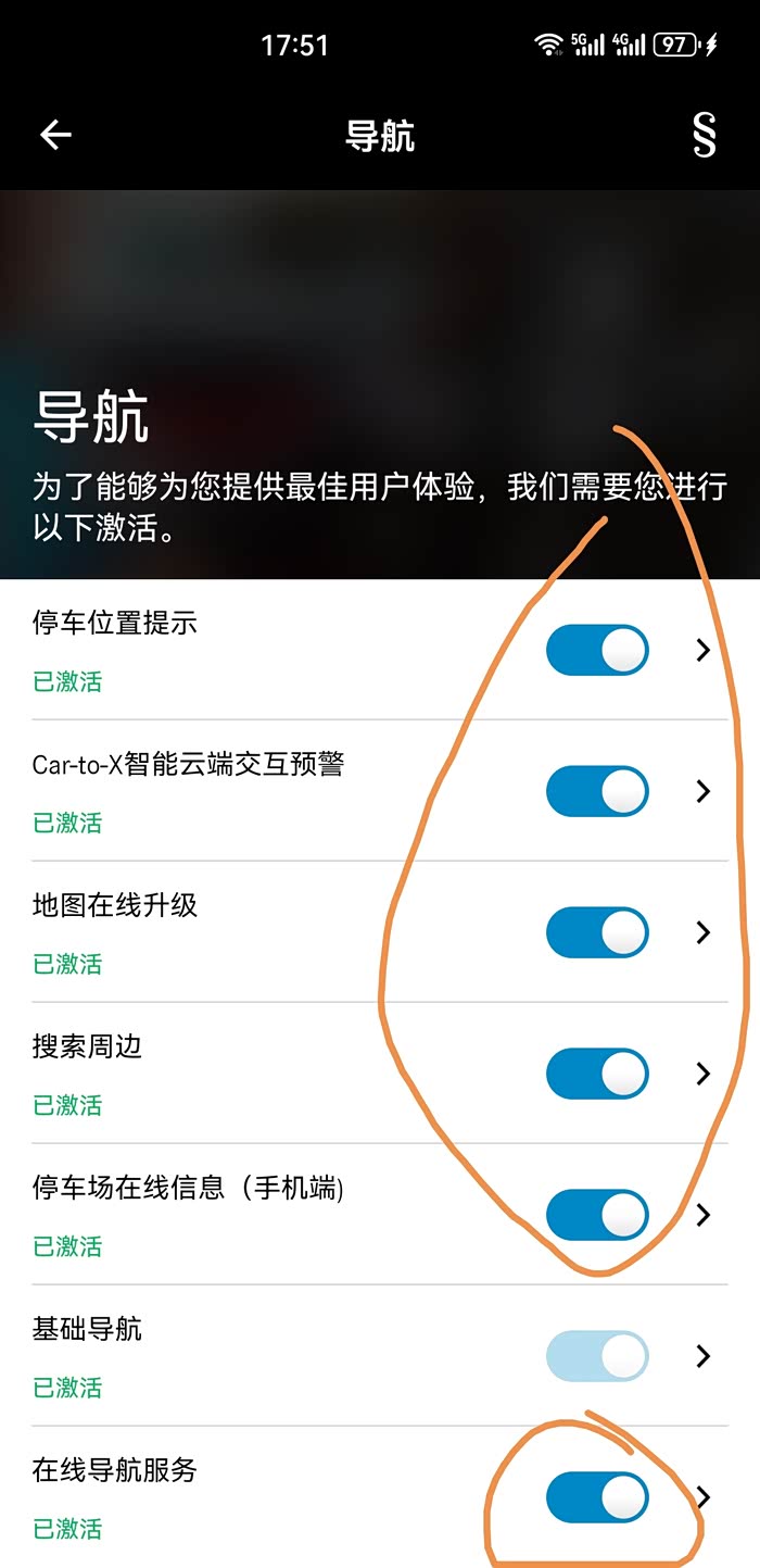 1.登录Mercedes me APP,在我的—点击车图片进入—管理服务—导航,把导航下的功能先全部关闭,然后返回上一层,再全部打开就激活行啦,就2秒钟时间搞定!!