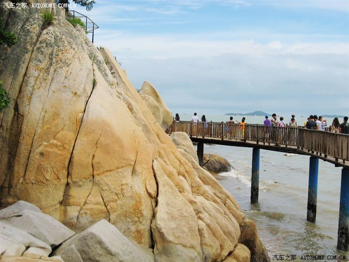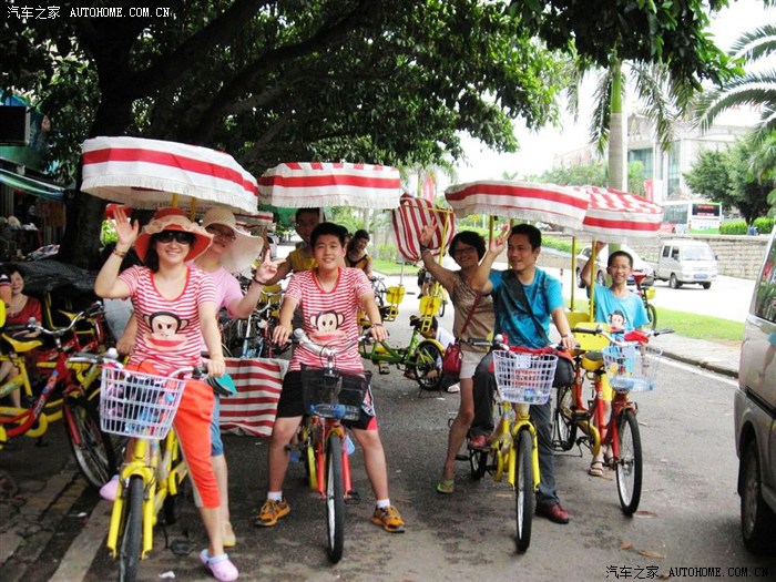 后步行至胡里山炮台附近的自行车租车点,取预订的自行车。双人自行车4辆,上面还有彩色条纹布的凉棚。(某宝预订1小时10元)环岛路的风景确实不错,天气良好,能看见金门岛和对面海沧区。