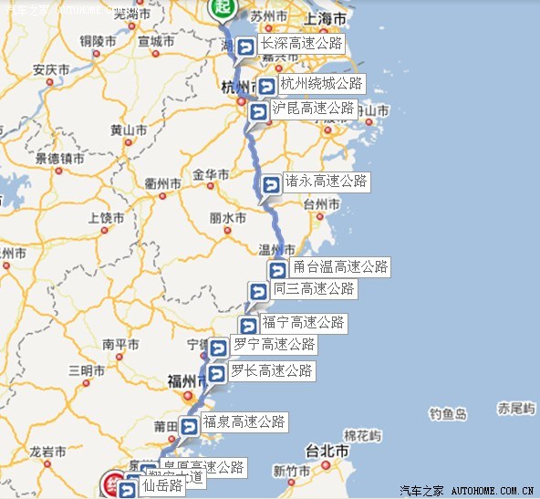 路线 宜兴市——湖州市——杭州市——金华市——温州市——福鼎市——宁德市——福州市——莆田市——泉州市——厦门市。