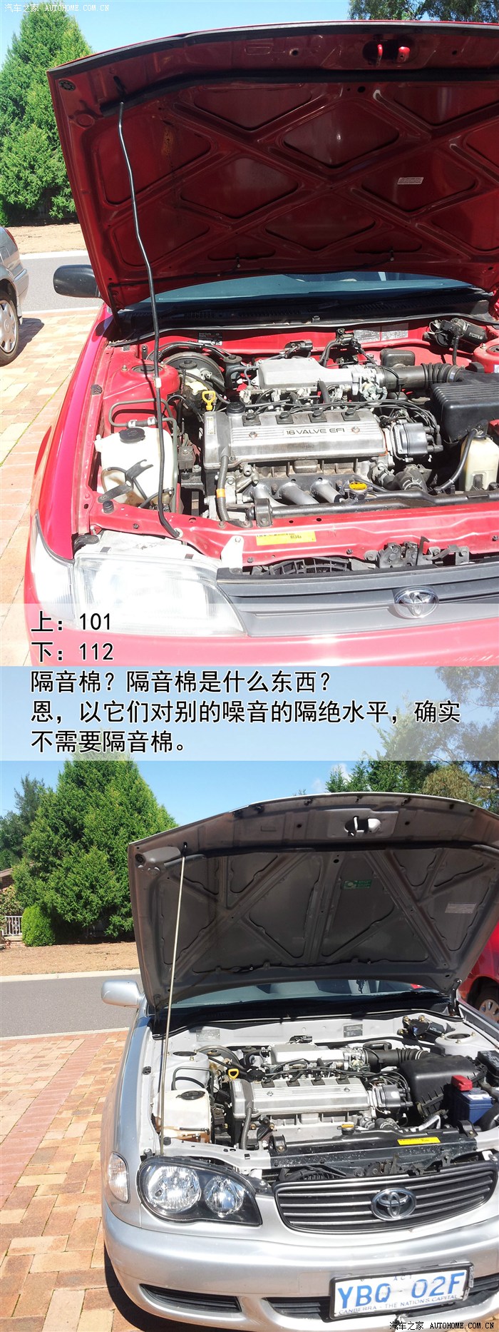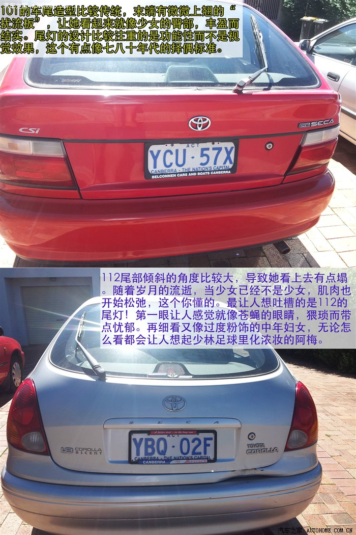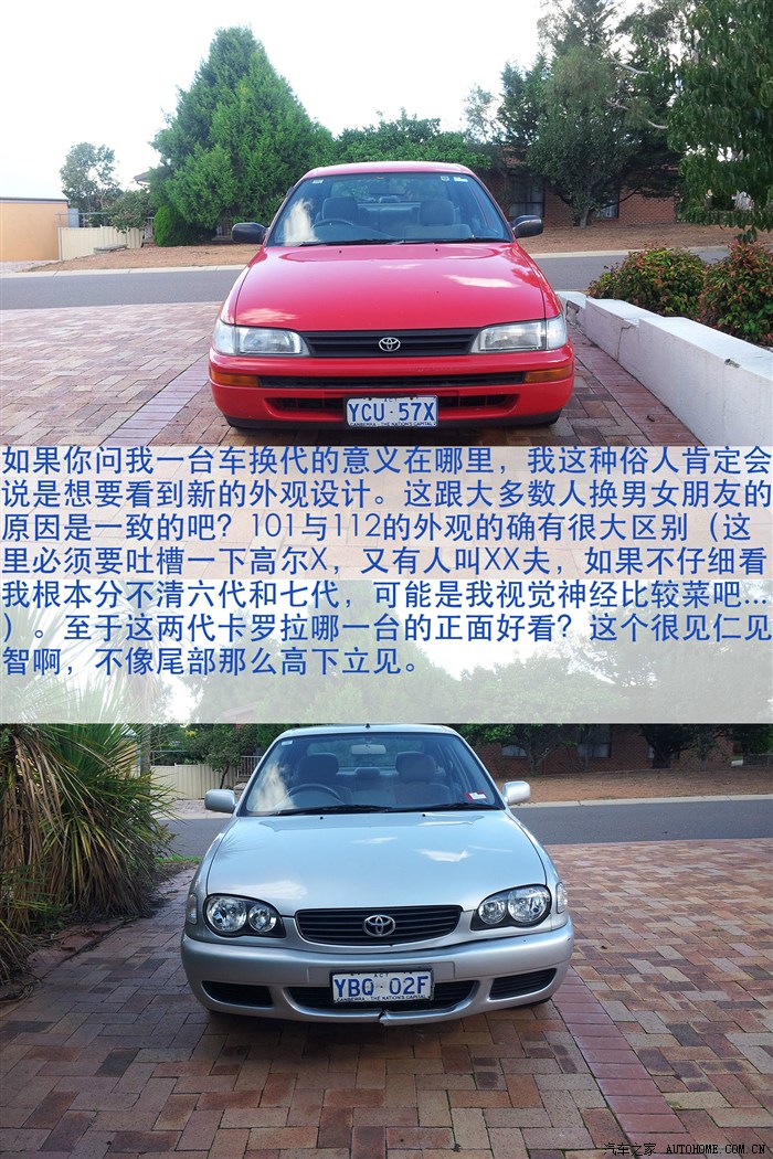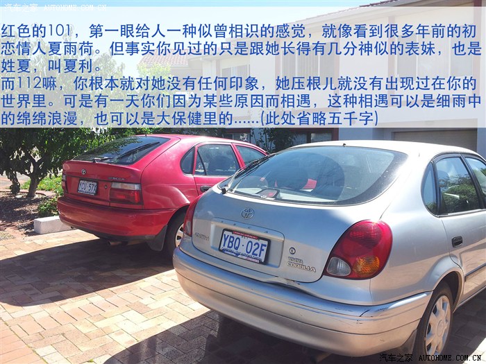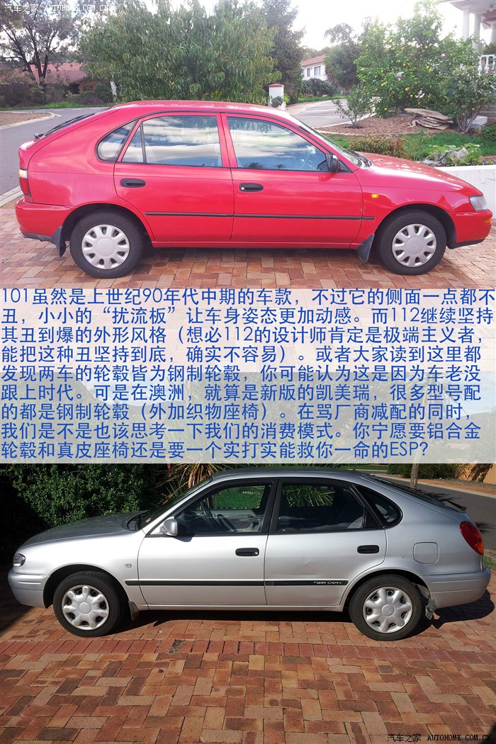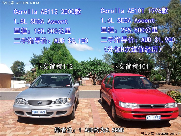 在汽车之家经常能看到那些土豪,地主,高富帅各种发海外提豪车的作业。其实本人对这种刷存在感的行为是极度不认同的,而对于这种罔顾他人感受,视钱财如粪土的有钱人,我只想说,可以送我一台吗?言归正传,简单地用5000字介绍一下本文的作者与本文的写作目的吧。本文的作者是两个屌丝中的战斗机,身在澳大利亚攻读博士学位,闲时送送pizza在导师不知情的情况下***小工,典型的80后三无双失落魄青年。本文的写作目的,这个就高尚了,就是让大家看一看,其实国外不全都是乡绅不全都是土豪,虽然你在之家海外论坛上面看到的都是神车豪车,但也有千千万万劳苦大众(ps:此大众非彼大众)开着破车谋着出路。下面就对比一下我们俩屌丝的小破车,它们分别是AE101 和 AE112(两车都是卡罗拉的低配车型,不同的是前者排量为1.6,后者排量为1.8)。
