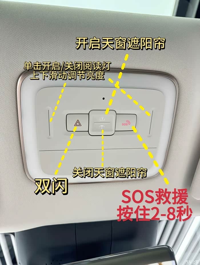 这款车的双闪双跳灯的开关就是涉及到了车辆前排顶部阅读灯的位置,主驾驶的位置抬头看一下,在天窗控制按键左前方一个红色的就是双闪的控制开关