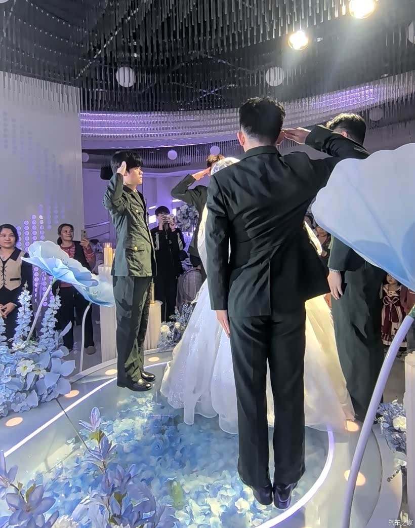 典礼开始,新人上台后,便到了我们战友的特别环节。主持的战友笑道:“接下来,有请战友团送上专属祝福!”四位战友随即迈步上前,为新娘轻轻披上并理好头纱——这是我们事先商量好的祝福,动作不算标准,却足够真诚。我及时按下快门,定格这温暖一瞬。合影时笑声不断,仪式继续推进。