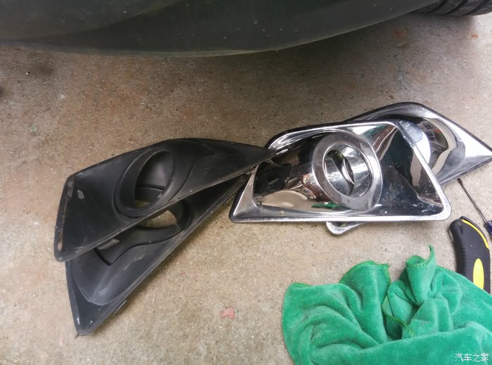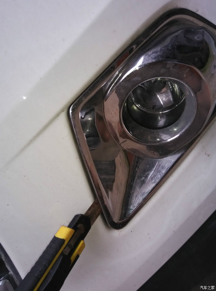 这是好早时买的雾灯罩,只有取舍了。因是用3M胶粘的,用裁纸刀沿四周划开再翘几下就松了。拆了外罩再拆原有的罩了。因全场本人一人在工作,这张照片本人一下没拍到。它也是用小的一字螺丝刀再包一层布插进去撬的,里面全是塑料卡扣韧性好,放心吧!
