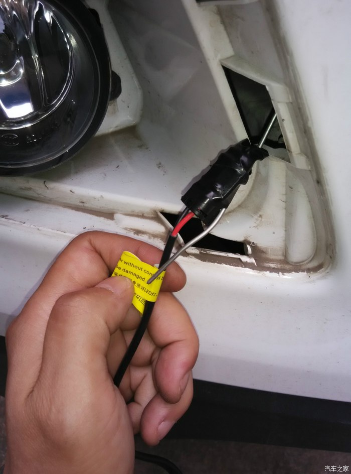 线算是走完了,下一步该是接电了。当然,各位亲货一到手在安装之前就应该试一下的。那个步骤我在此就没有提到,一个人,不方便啊!下图的具体接线方法都有示意图的,第一根白色线接大灯的近光灯(可以在近光灯开启时该雾灯亮度自行减弱)可以选择不接,因为我也没有接,用黑胶布缠好丢在一边。