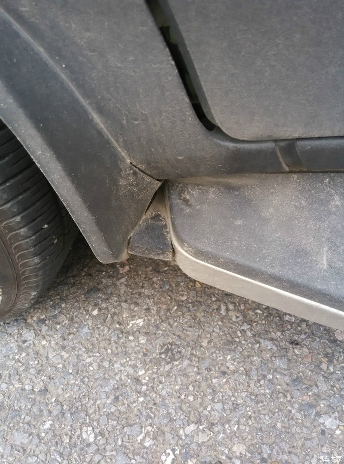 挡泥板与侧踏接缝处:由于近期雨季,好久没洗车了,灰尘、泥土勿看吧!因为我这款侧踏是SUV通用型的,不是那款原车专用带包裹的。所以在接缝处就显得有点大缝隙了,在轮胎行驶中泥水免不了践踏车身,所以我就自行加装了个三角形的橡胶皮。可别小瞧它,小物件、大作用哦!当然,大家不仔细看也发现不了,就算发现了也不会影响整体效果的