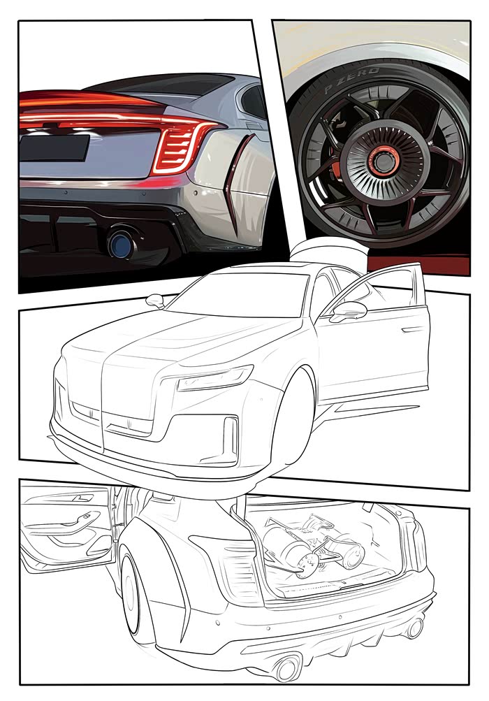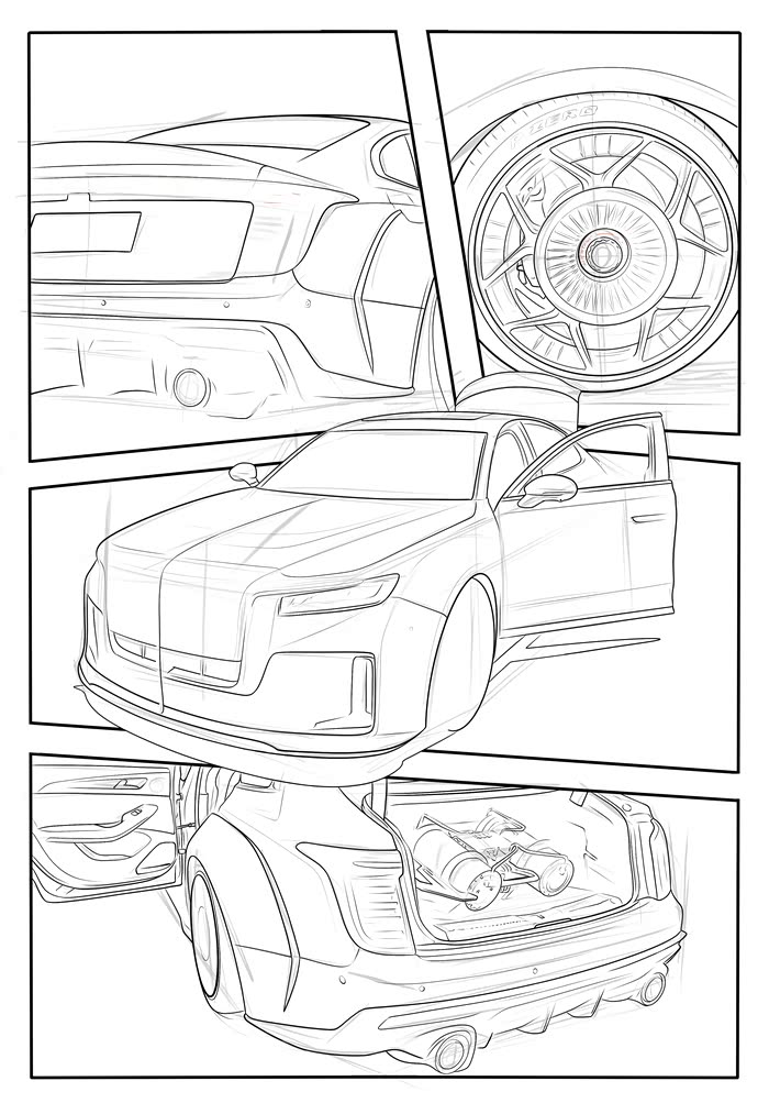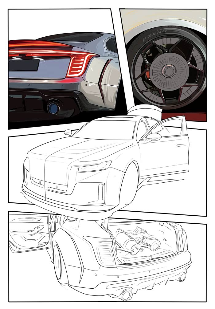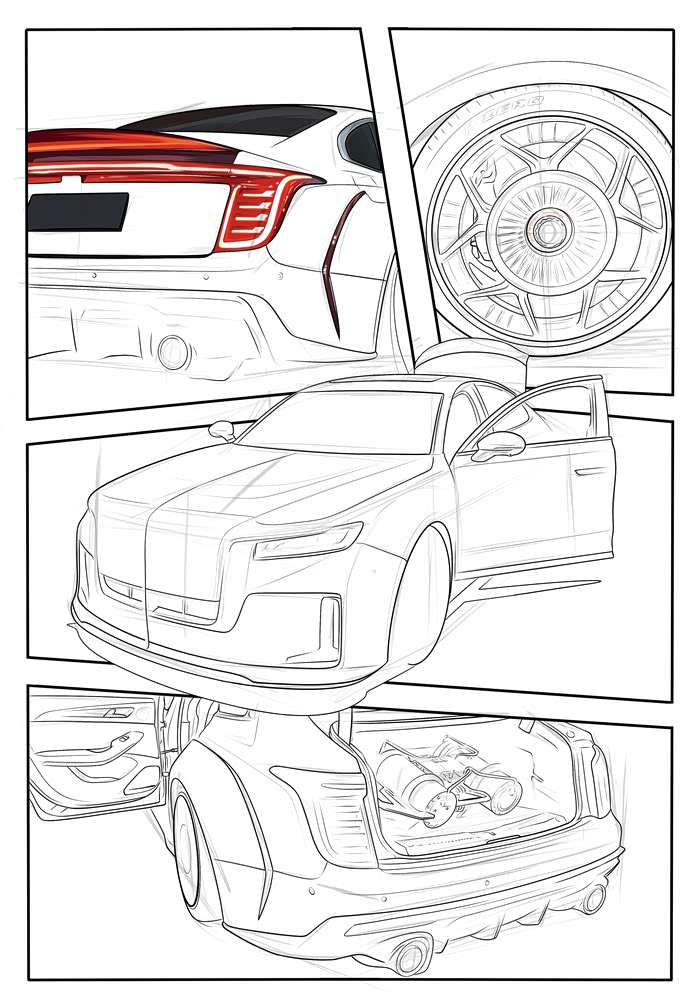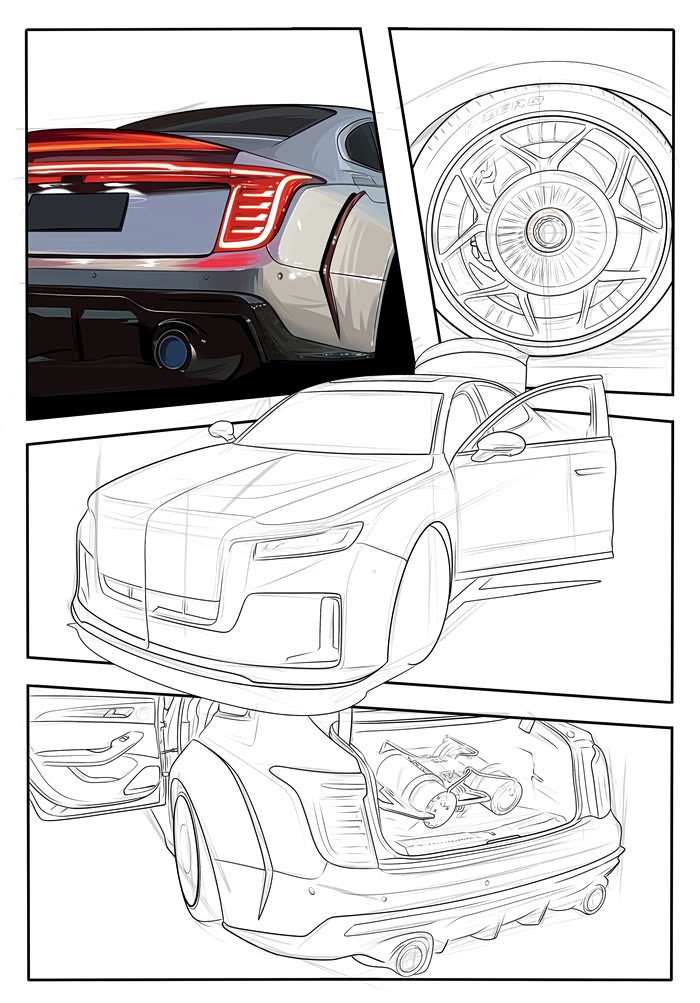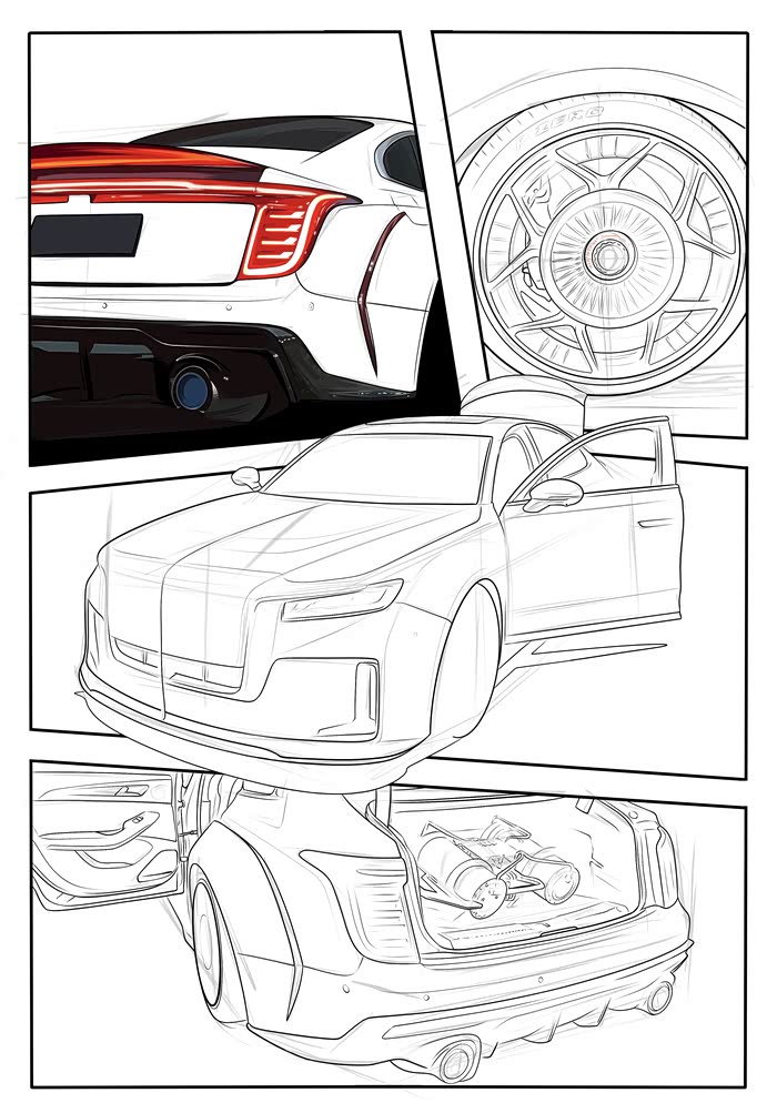 降低草图透明度,在进行细致的勾线,吧车身流线细节都绘制出来。