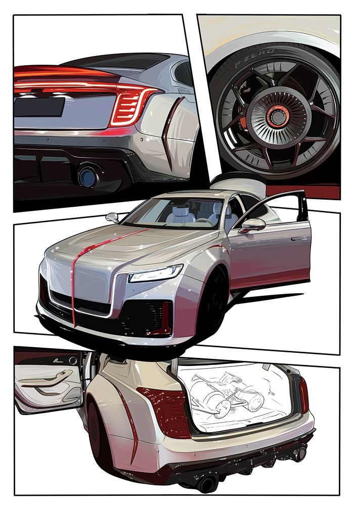 V6机械增压发动机和7速双离合变速器,改装时使用发动机外挂电脑来提升车辆的动力性能。在车尾的排气管内,还安装了两台航空涡轮喷气发动机,来进一步提升车辆的加速能力。两台涡轮喷气发动机由航空煤油提供动力,航空煤油箱隐藏在后备厢底部,启动开关位于仪表台,驾驶席位的遮阳板内装有涡轮发动机的运行状态显示屏。除此之外,空气悬架也经过改装,避震器工作行程得到大幅提升。打开电动后备厢舱盖,便有一套经过精雕细琢的气罐映入眼帘。