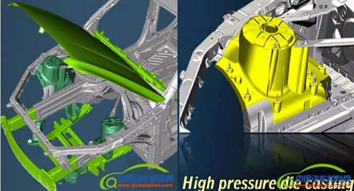 另外,在shock tower (减震器支座)采用压铸铝合金,将15个零件集成为一个整体,提高了车身的刚度,并减重40%。这个技术一般在路虎、BMW X5等豪华车上才能见到。