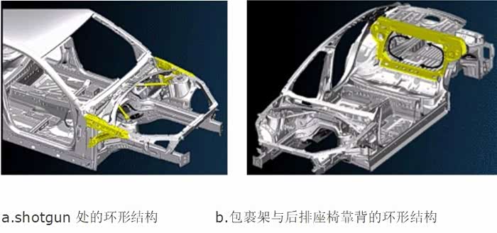 报告显示,该车身的静态扭转刚度为29000Nm/°,比上一代产品的刚度提升近10000Nm/°。根据报告说明,刚度的提升主要通过在刚度敏感位置的设计,包括前舱增加提高刚度的拉杆、shotgun处的环形结构,包裹架与后排座椅靠背的环形结构。该车的轻量化系数为2.34,比上一代产品轻量化系数降低37%。轻量化系数的降低主要得益于车身刚度的提升,同时车身重量也比上一代轻17%。