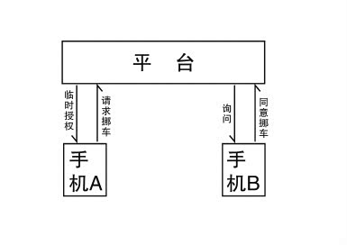 本文开头也说过,停车难的问题也包括找不到车位或是被迫要求挪车。如图2图3,当你把一辆分权式汽车B开到某一地方发现找不到停车位的时候,你只能把车停靠在别人车辆A傍边,此时必然会挡出别人车辆A的出行。当别人要把被挡出车辆A开走的时候,可以下载一款与你手机同样的控制分权汽车的挪车APP(此APP只需下载一次并注册就终身可用,以后无需再下载注册,可直接快速的使用)通过扫描车牌号码发送挪车请求给挪车APP所属的后台,后台在征得你同意后然后把该分权式汽车的停车辅助装置控制口令暂时授予对方手机上的APP,这样让对方自行将你的分权汽车B(注意,这里只是控制你的分权汽车的停车辅助装置,而不需要进入或触碰你汽车的本身)向前挪出一段距离,这样你本人不需要到达现场就可以实现挪车了,当对方把他自己的车开出停车位的时候,再将你的汽车停到停车位上,最后你可以把停车辅助装置临时控制权收回,整个过程可以用360度车身摄像头进行监控以防止出现意外。