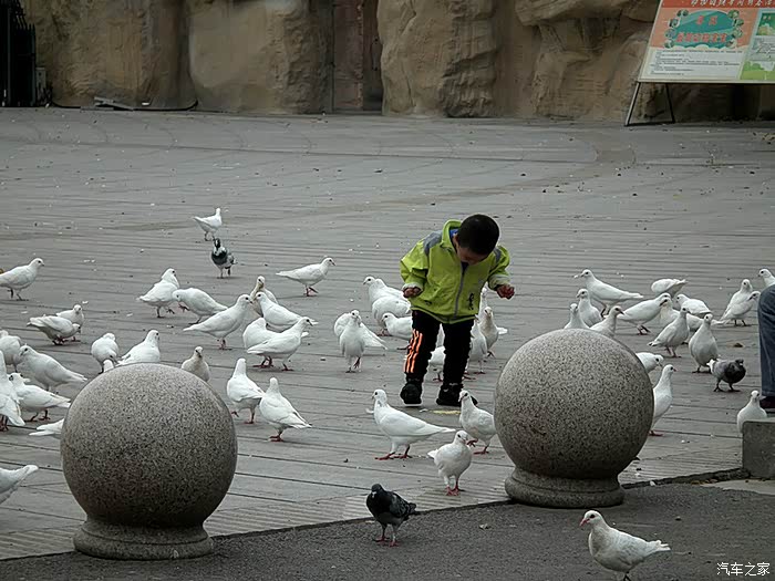 一位小朋友正在喂鸽子