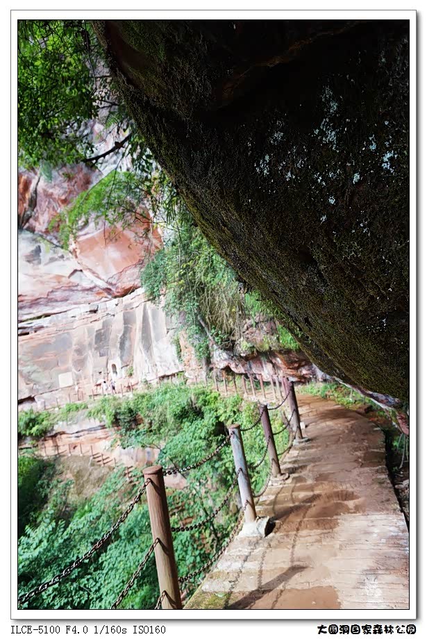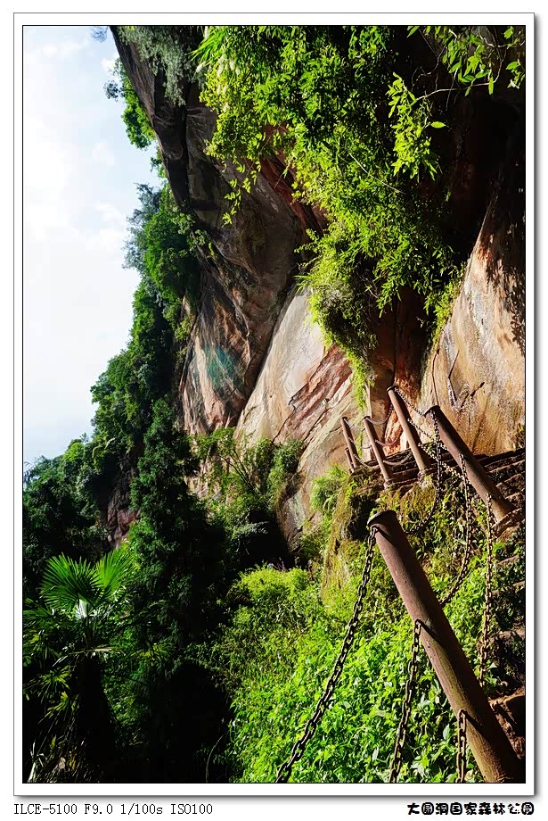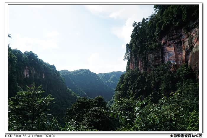 园区地质景观极具特色。其峡谷深幽、瀑潭重跌、悬崖赤壁、洞穴广邃、怪石奇异、峰岭险列,极具观赏价值和科考价值。园中的七条幽深峡谷、十四面红岩绝壁、二十八道断崖岗峦、三十二座奇峰峭岭以及无数尊奇异怪石,把公园丹霞地貌的独特风姿展现得淋漓尽致。神龟山、仙女峰、沙弥石等栩栩如生,肆情地演绎着人世间的喜怒哀乐与悲欢离合。大圆洞以它气势磅礴的赤壁天崖与临空高悬的银帘飞瀑一起,构成了一幅撼人心魄的壮丽画卷。