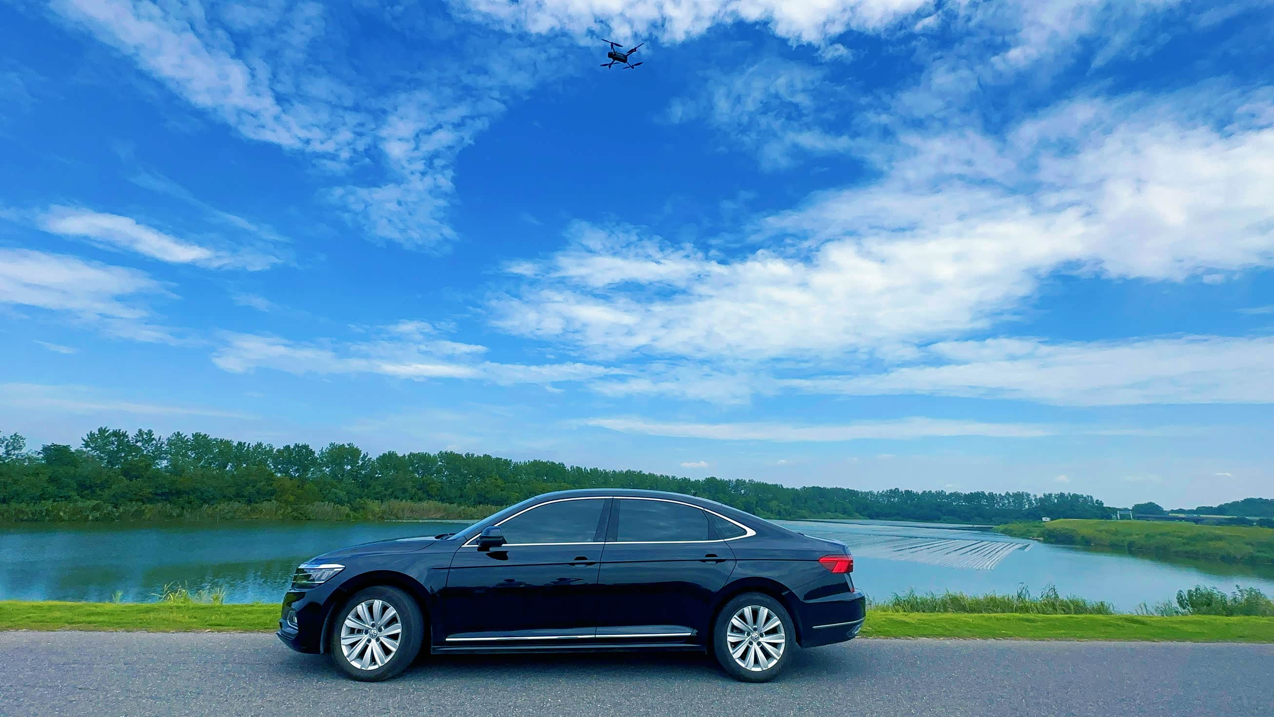 我那黑色帕萨特就静静停在湖边,阳光一照,车身亮锃锃的,透着一股沉稳大气劲儿。车顶上还放着无人机,就等着找个好时机飞起来,把这美景都录下来。