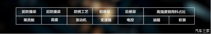 乘员舱:纯平地板、结构左右对称、上纵梁极长紧密连接主纵梁、增加钢制挡板、更好应对偏置碰撞