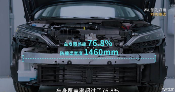 前防撞梁:宽度长、覆盖率高、一共4个吸能盒、额外有副防撞梁