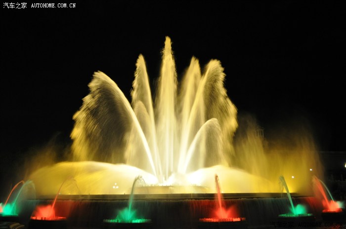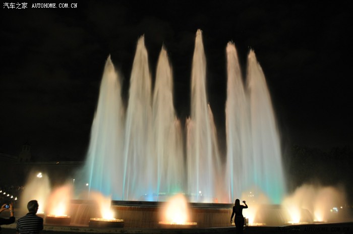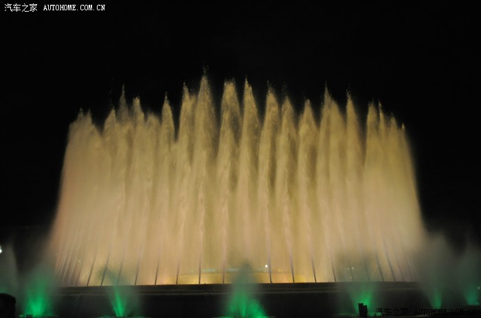 音乐喷泉,好多人坐台阶上,喝啤酒,听音乐