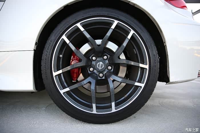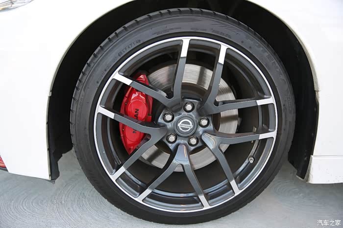 19寸rays5幅轮毂 前245/40 后285/35 和大哥GTR 还有美国国宝 克尔维特一样的胎宽。红色大鲍鱼 前4后2 不知道为什么这一代不是brembo 而是直接写上了nissan。